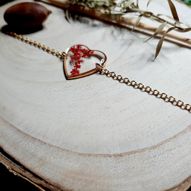 Bracelet remplis d'une fleur Ammi Majus rouge séchées puis découpées puis encapsuler dans la résine.