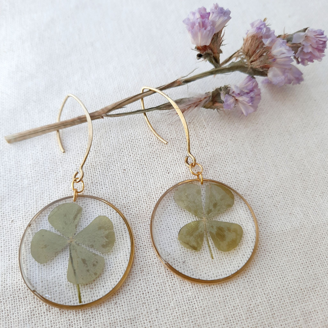 Boucles d'oreilles, remplis avec des Trèfles 4 feuilles séchées puis découpées puis encapsuler dans la résine.