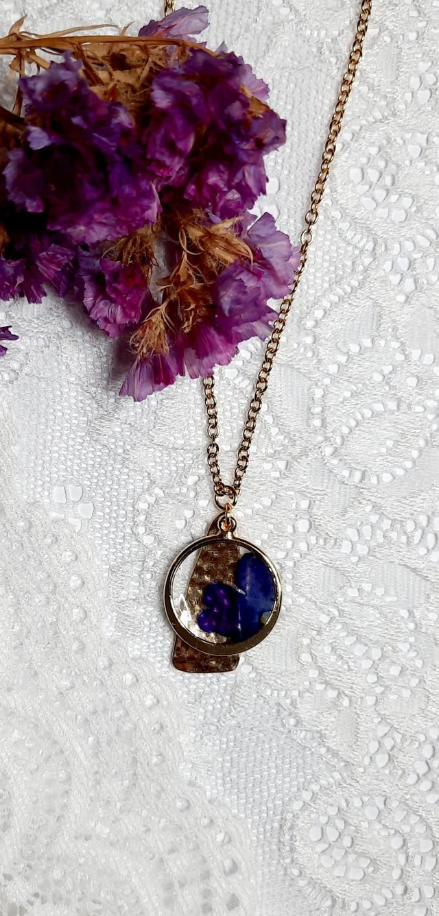 Pendentif en plaqué Or rempli d'une fleur appelé Verveine de couleur violette, séchée puis encapsuler dans la résine. Verveine: